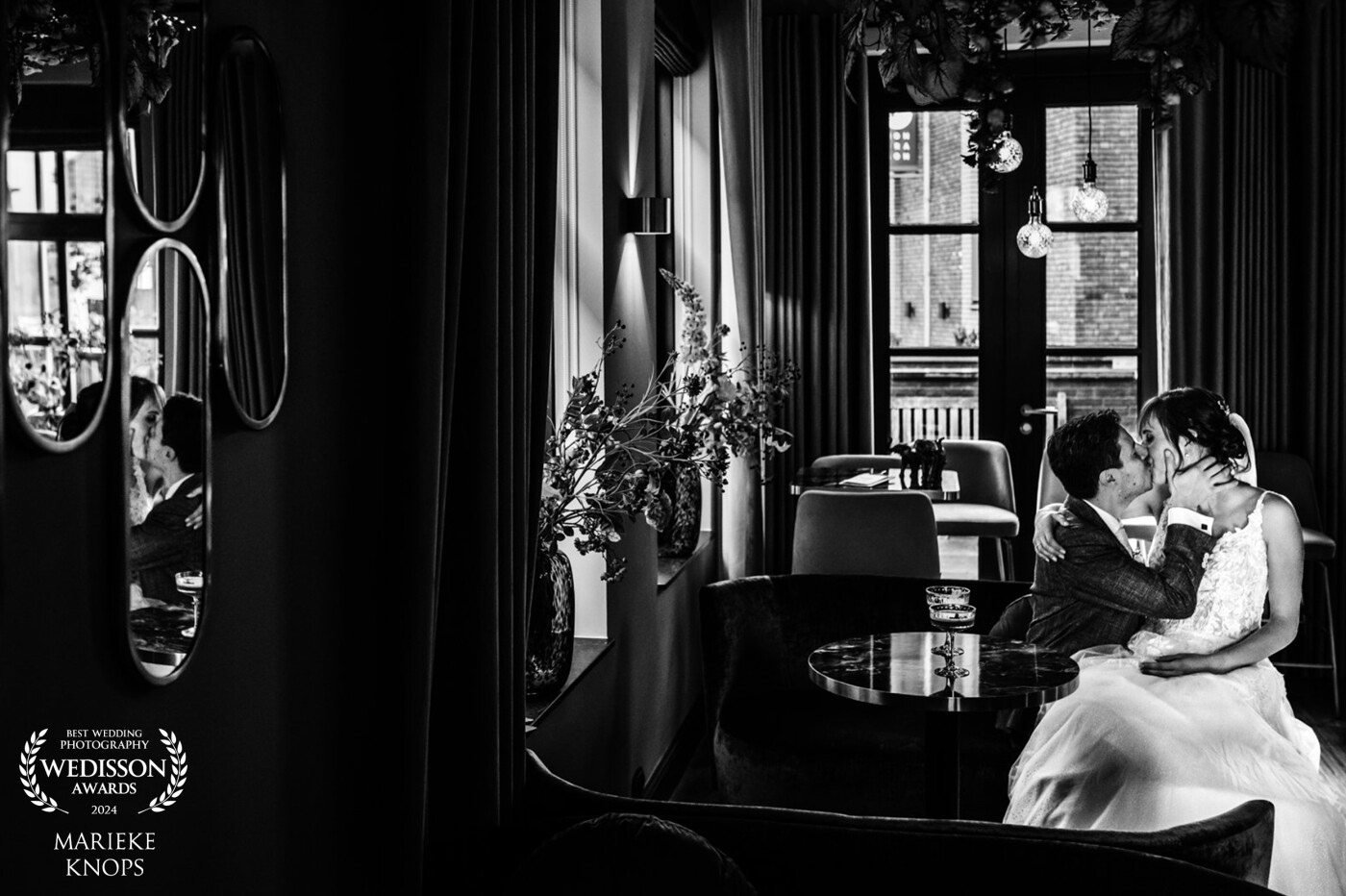 This beautiful couple choose a nice hotel for the photoshoot. It works perfect and extra with the reflection in the mirror.