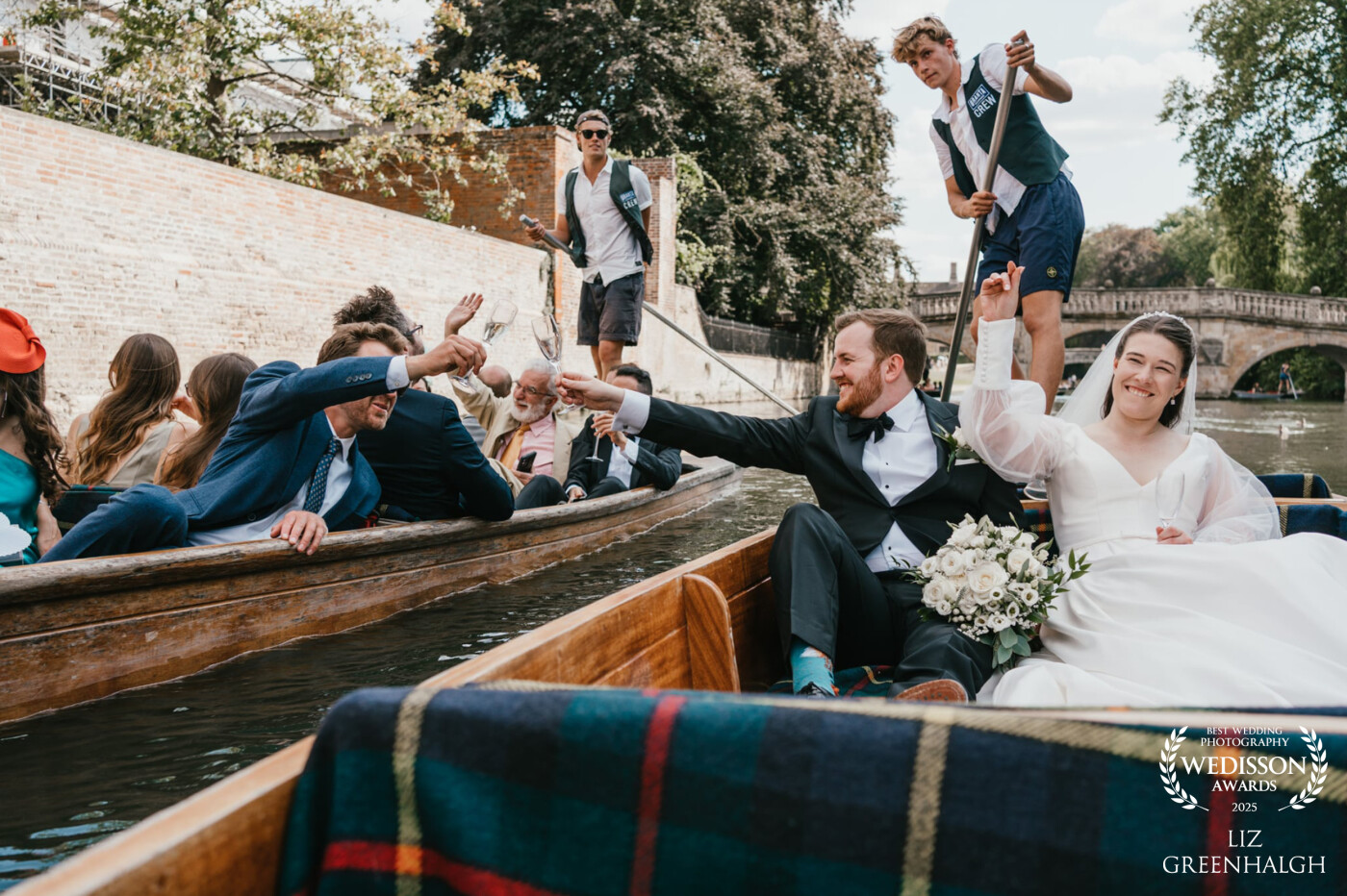 Gliding alongside their guests, Eva & Nick celebrated with a Punting trip on the river Cam after their wedding