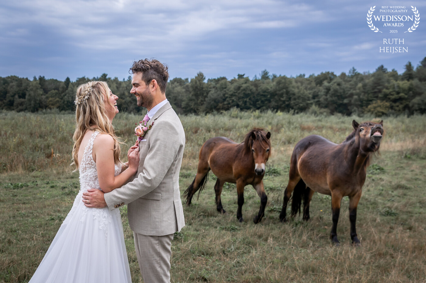 Amidst a vast open field, the bride and groom stood together, still glowing from the ceremony that had just taken place. Two wild horses slowly approached them, and at the very moment the couple shared an intimate, joyful exchange and the bride burst into laughter, one of the horses instinctively joined in, curling its upper lip and neighing along.