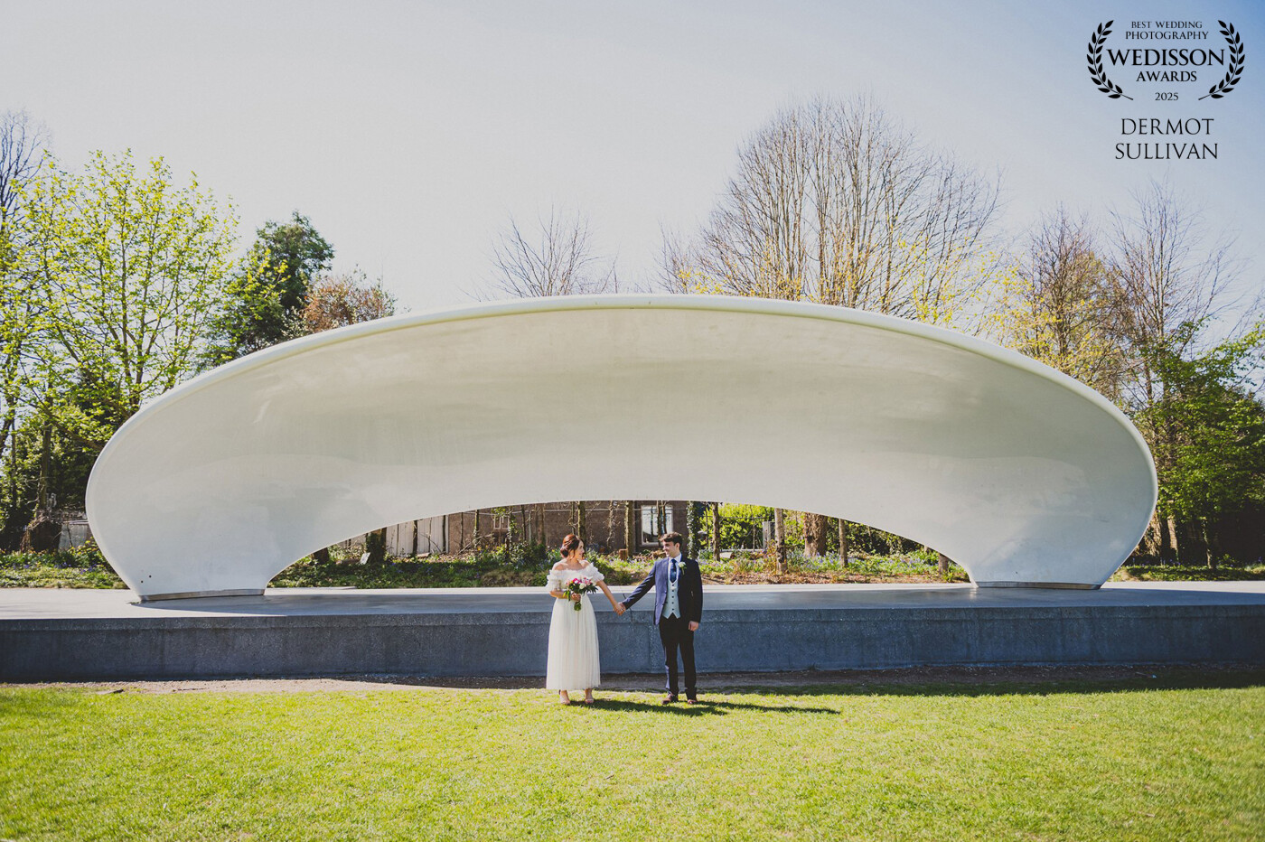This photograph was taken in FitzGerald's Park in the centra of Cork City. I've always liked the piece of architecture, it's a stand for sports spectators to stand in and on the day, I goy my couple to stand, slightly apart, in front if it.
