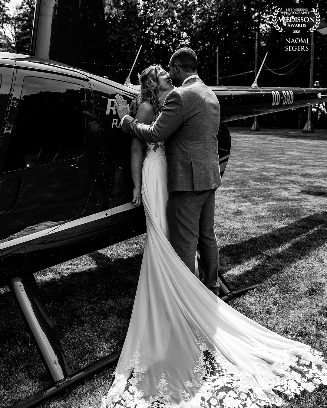 Love takes flight. Just after arriving at their wedding venue by helicopter, this couple took a quiet moment together โ leaning into each other, grounded in love while surrounded by adventure. A perfect blend of elegance, intimacy, and bold romance captured in one frame.