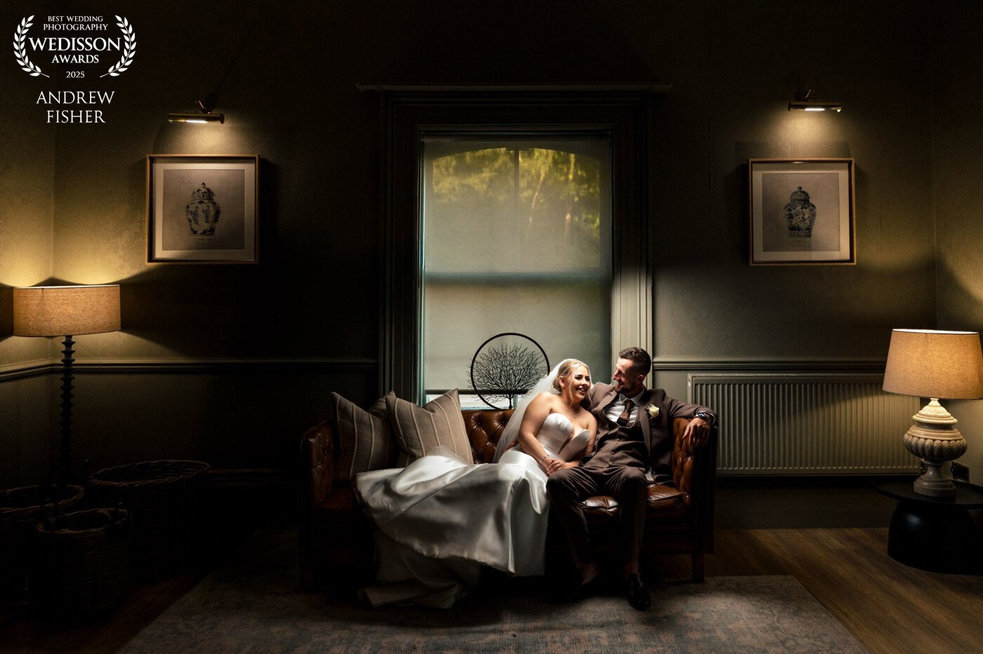 Photograph of Ben and Sophie at Hackness Grange, enjoying a moment away from their guests together in the cosy bar.