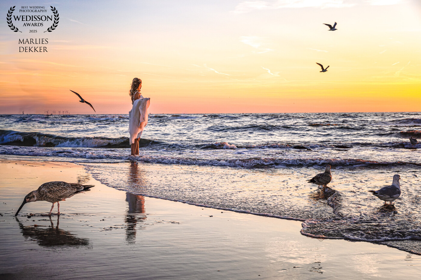 A sunset like this with a bride surrounded by birds on the seaside.