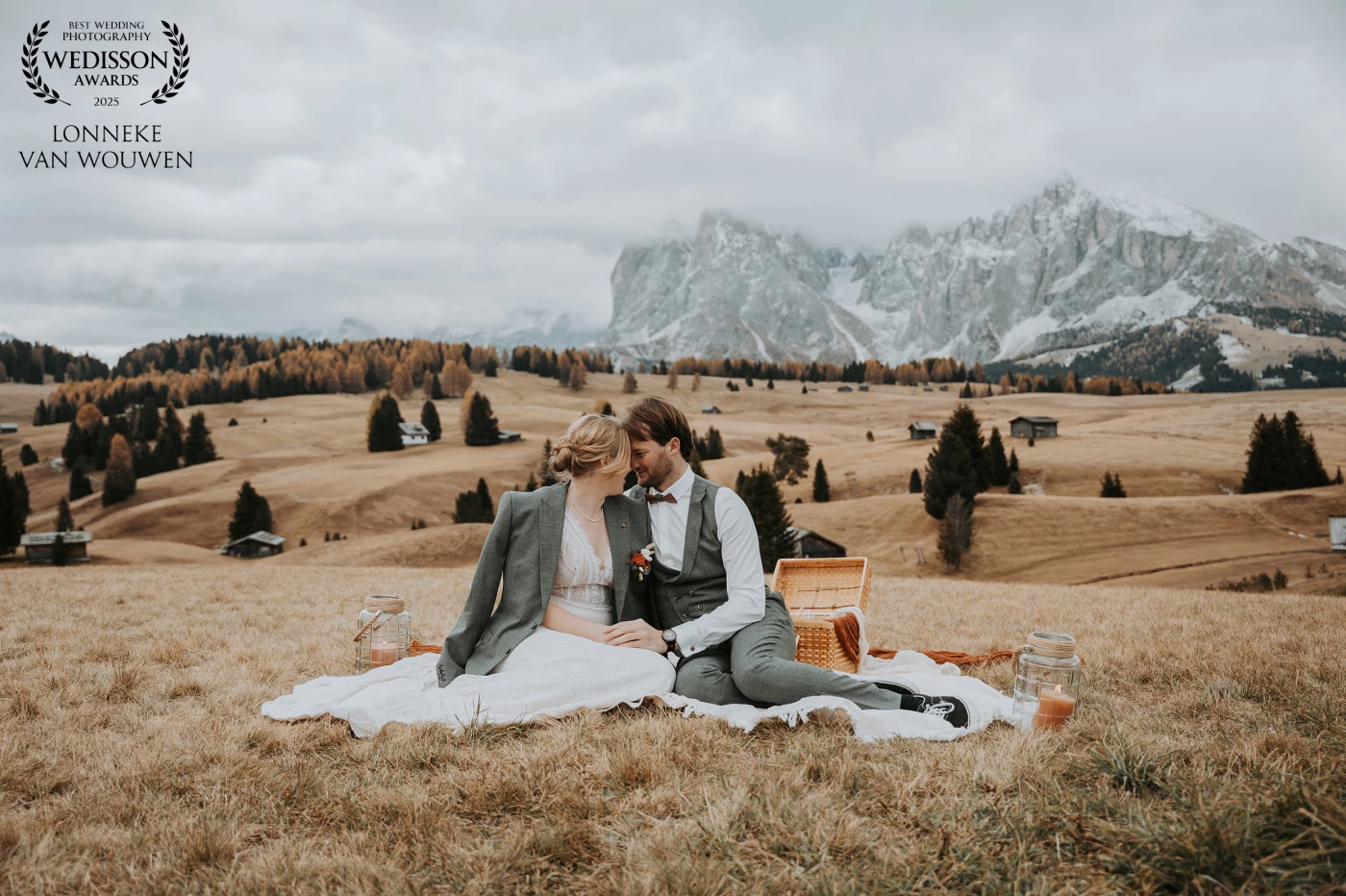 Tijdens de elopement in de Dolomieten had dit bruidspaar Apfelstrudel en thee voor op de berg tijdens een romantische picknick op deze fantastische plek!