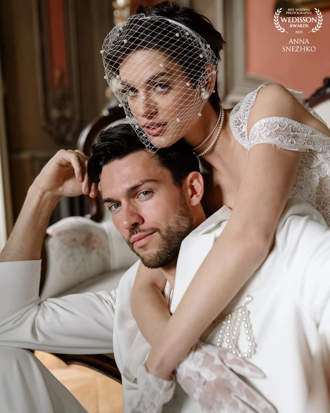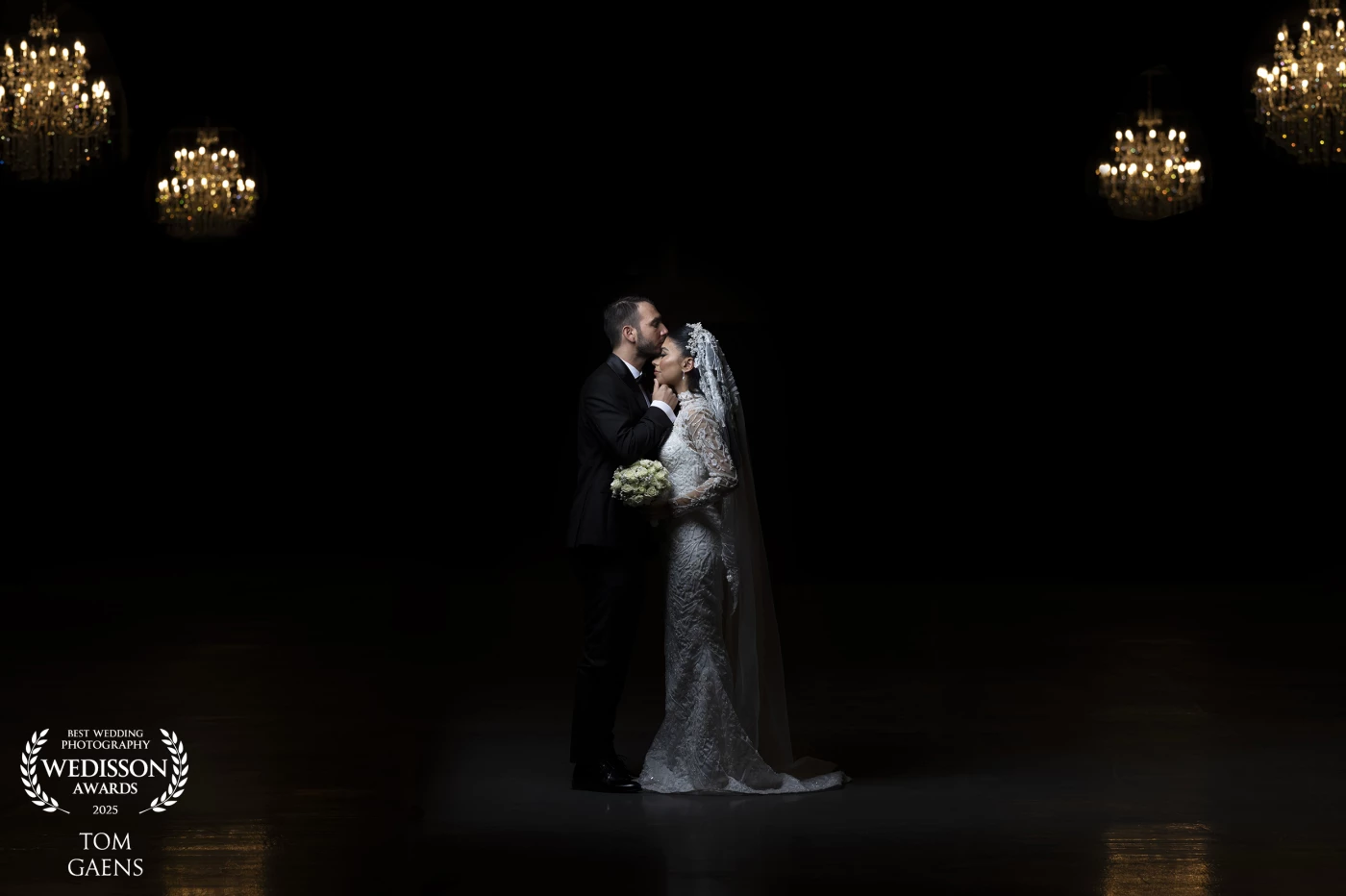 This image was created in complete silence. The room was empty and free of distraction. Only the bride and groom remained beneath the chandeliers. By removing everything else, the photograph becomes about presence rather than performance. Two people fully connected, sharing a moment that belongs only to them.
