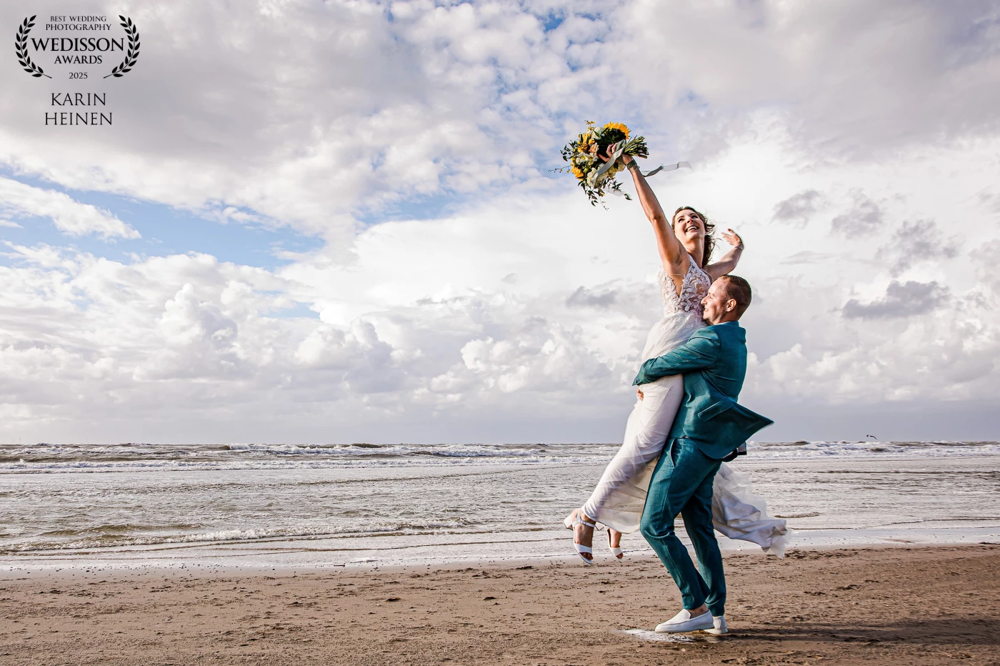 A beach wedding comes in many forms — at least in the Netherlands. The Dutch coastline is so unpredictable that, weather-wise, it’s comparable to Forrest Gump’s box of chocolates: you never know what you’re going to get. For D & D, it turned out to be a day with a pleasant temperature, fairly cloudy skies, and a strong breeze. Despite this, the North Sea was relatively calm. A perfect setting for this photograph, capturing the love of these two cheerful lovebirds