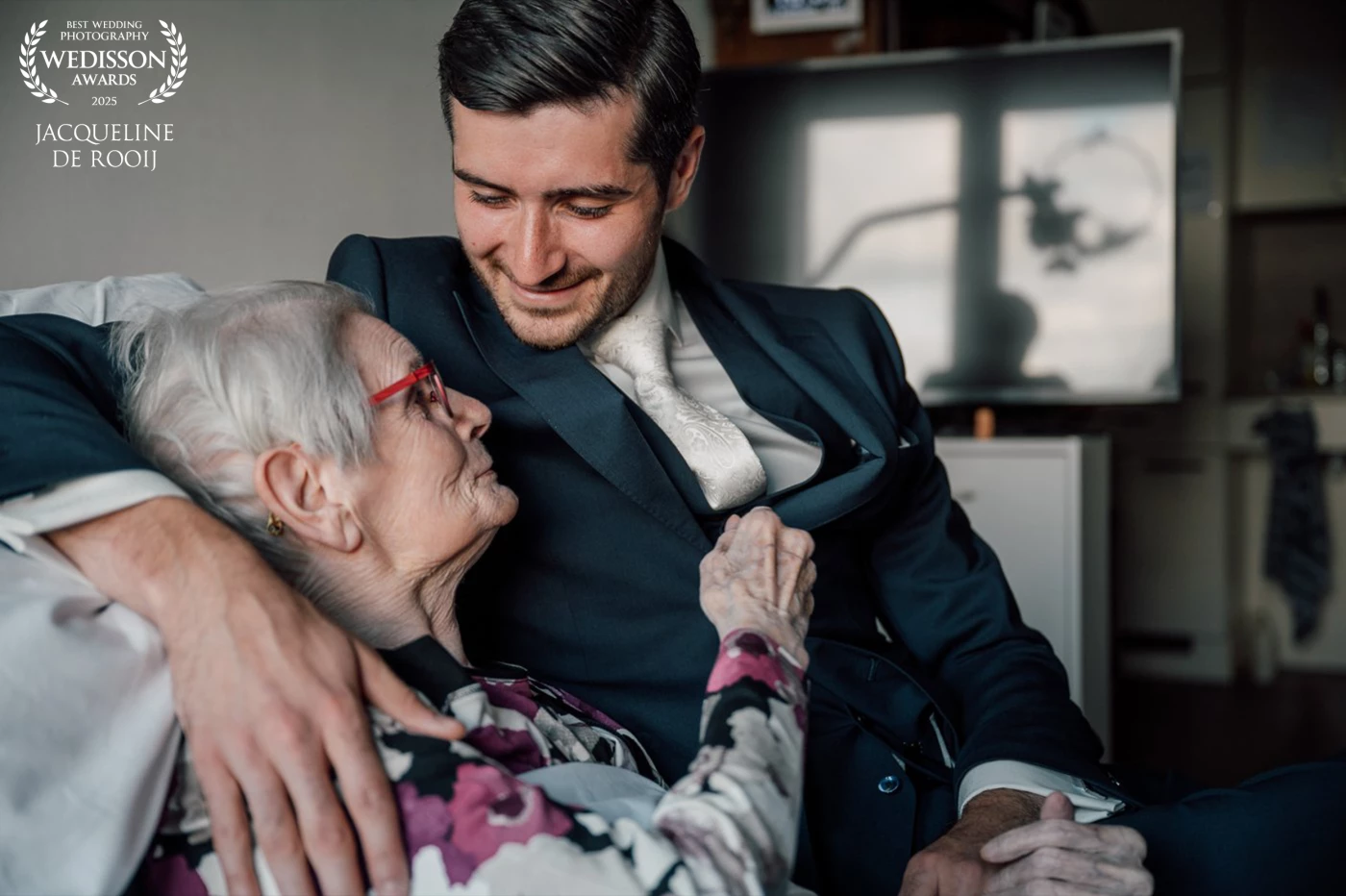 Such a beautiful quiet, intimate moment during the wedding day. The groom shares a tender embrace with his grandmother.; filled with love, gratitude, and unspoken stories. So sweet!