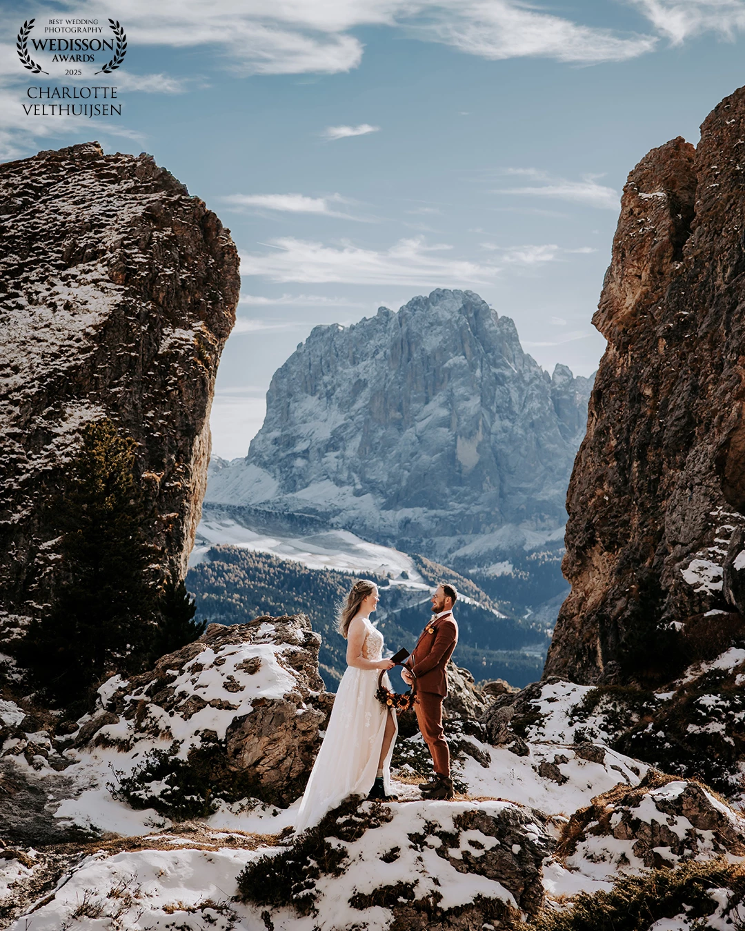 Framed by towering rock walls and a majestic Dolomite peak, they exchange vows on a snowy ledge, small in scale but huge in heart, a mountain-sized promise sealed with smiles