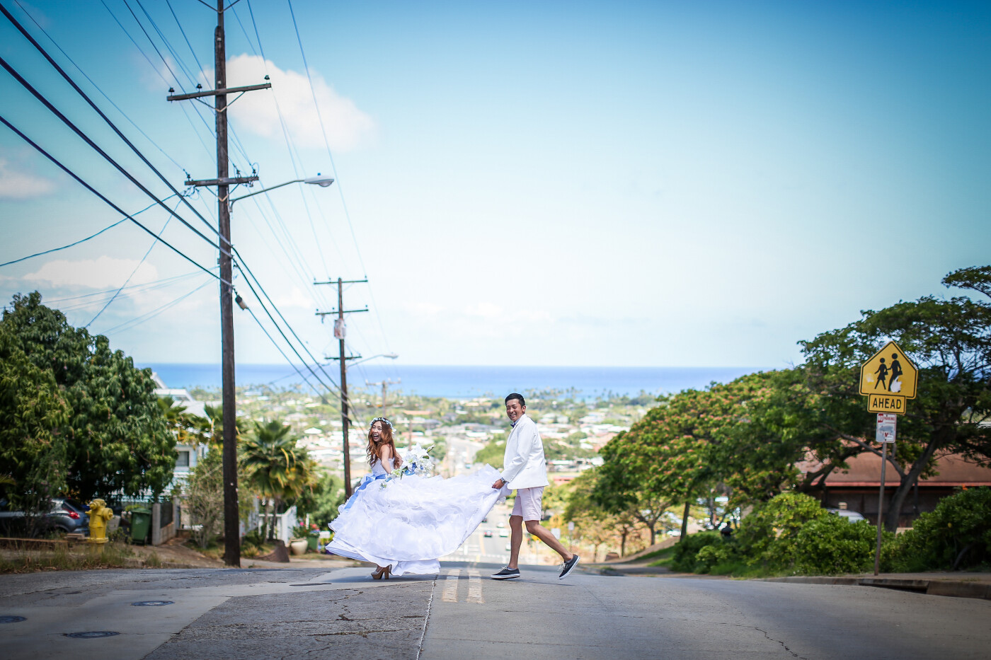 The most straight line at a steep gradient road in Hawaii. This road is Wilhelmina Rise. This photo seems very active bride and groom. By a photo tour, such as laughter is heard, it is a fun moment.