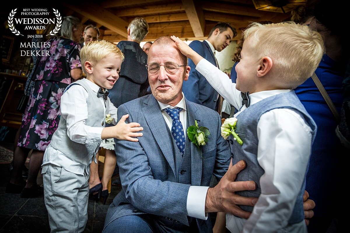 This lovely Grandpa wanted to get his grandsons to come to dinner, but the boys were teasing him one by one by stroking his just cutted hairdo. It had to slide on the floor under a table to catch this moment with my 16-35 mm as it was a really crowded reception, but with a really lovely result! <3
