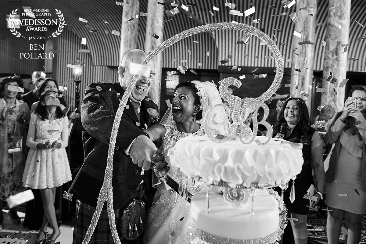 Part of the plan for this wedding was that the couple were to walk into the reception room and cut the cake with the confetti. I had all my lighting arranged in advance, and once I knew the couple were ready to enter I arranged all the guests around the cake with confetti at the ready. Once everyone was assembled i told them all to make some noise so that the couple would know when to walk in, it was a crazy 60 seconds of cheering and confetti with a chance angle through the support bracket for the cake using a 24mm.