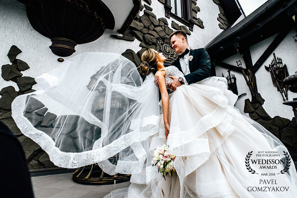 Vitaly and Valerya - a wonderful couple! This photo is taken immediately after the wedding ceremony. The gentle bride enjoys the courageous hugs of her beloved groom. She is incredibly happy now, Valeria looks like a flying bird!