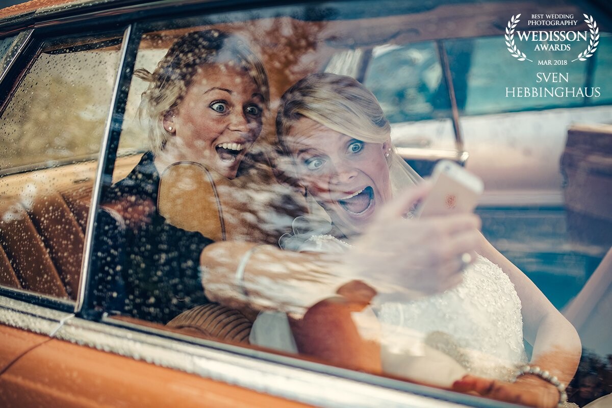 I took this picture during a beautiful wedding in the Westerwald (GER). After the ceremony the bride sit in the bridal car and she took that funny selfie with her bridesmaid.