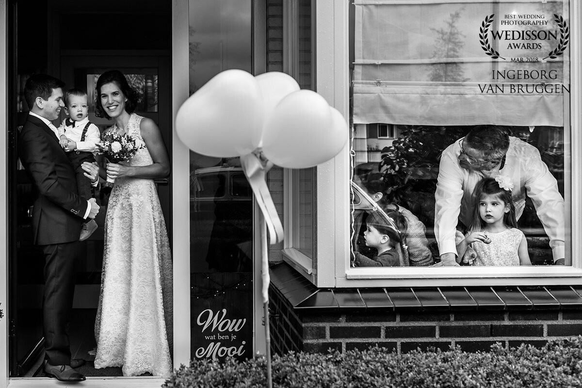 This is the ''first sight'' moment of the groom and bride. Their families can't wait to see them too. Next to the door is a board with ''wow wat ben je mooi'' witch means: ''Wow, you are so beautiful''.