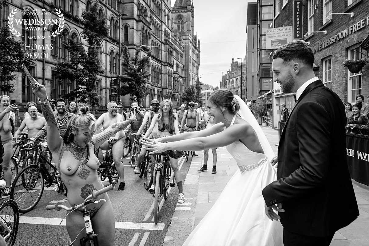 The wedding was in Manchester city centre and we went out the hotel for some portrait photos. On our way out to the hotel we heard some noise at the back. The bride was intrigued and decided to run back to see what was happening. We found the annual Naked Bike Ride and her hairdresser in it.