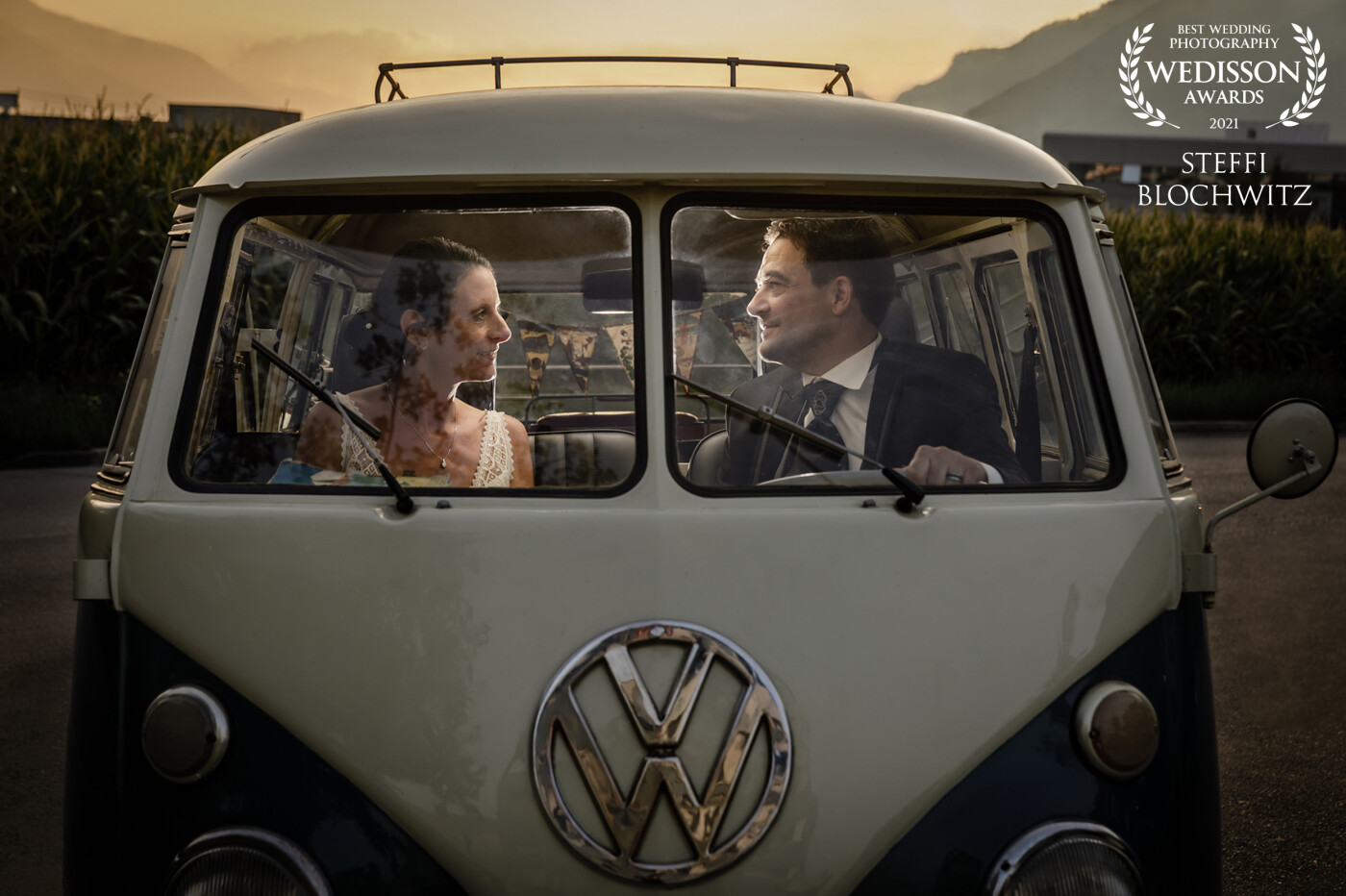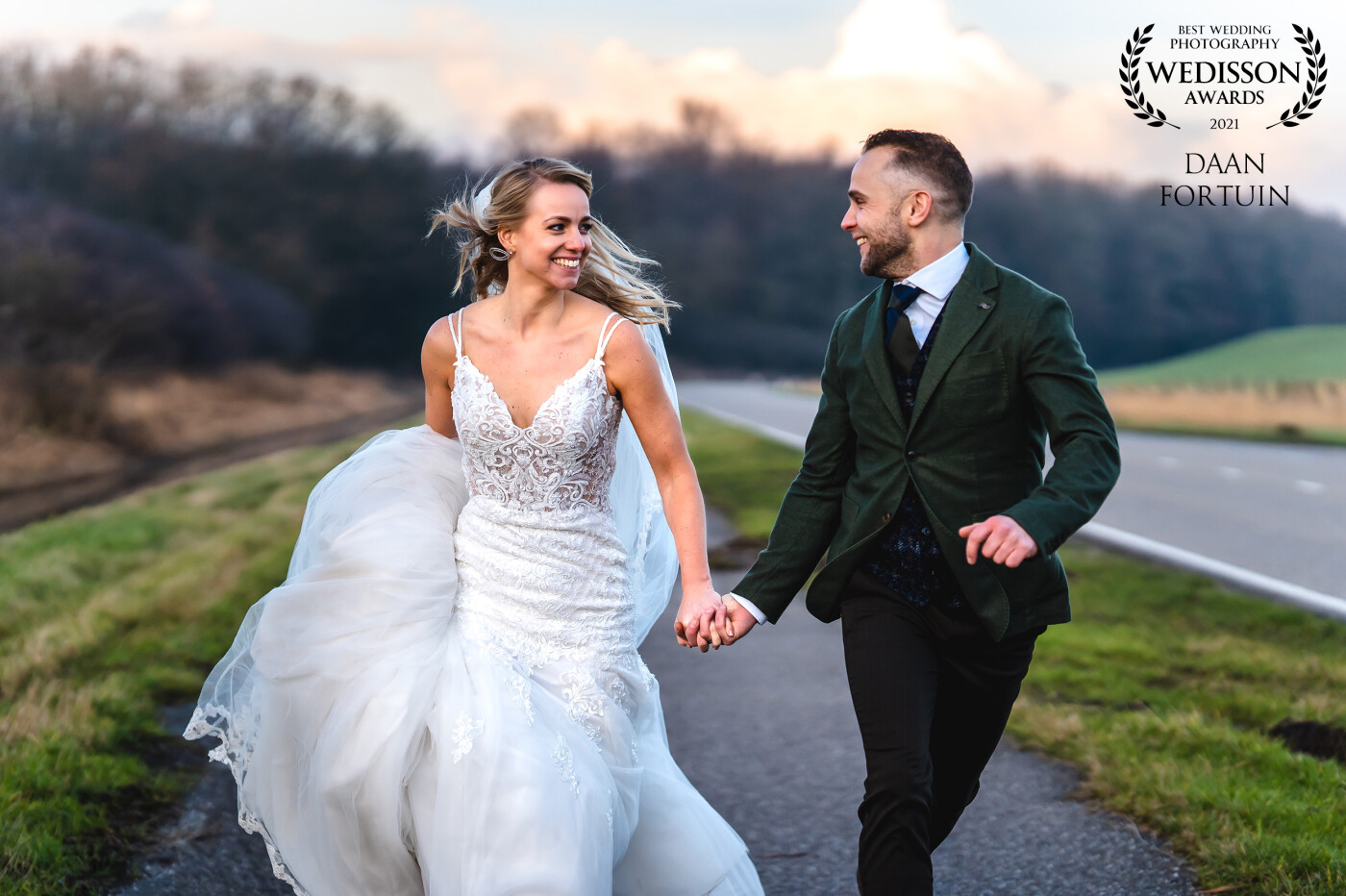 Driving back from the photo shoot, the evening sun broke through ... We had to take advantage of this moment! We took the first highway exit and made this photo. It was cold but this couple was on fire!