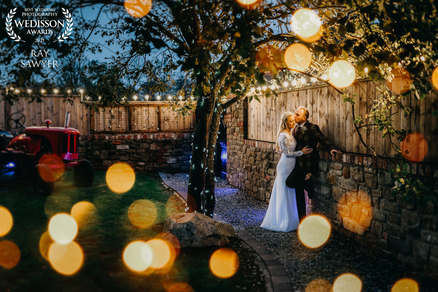 Bonfire night wedding at The South Causey Inn. The have LED lights everywhere which always looks great so I whipped some extra lights out my bag to help frame the couple beneath the tree. No flash here just ambient from the lights.