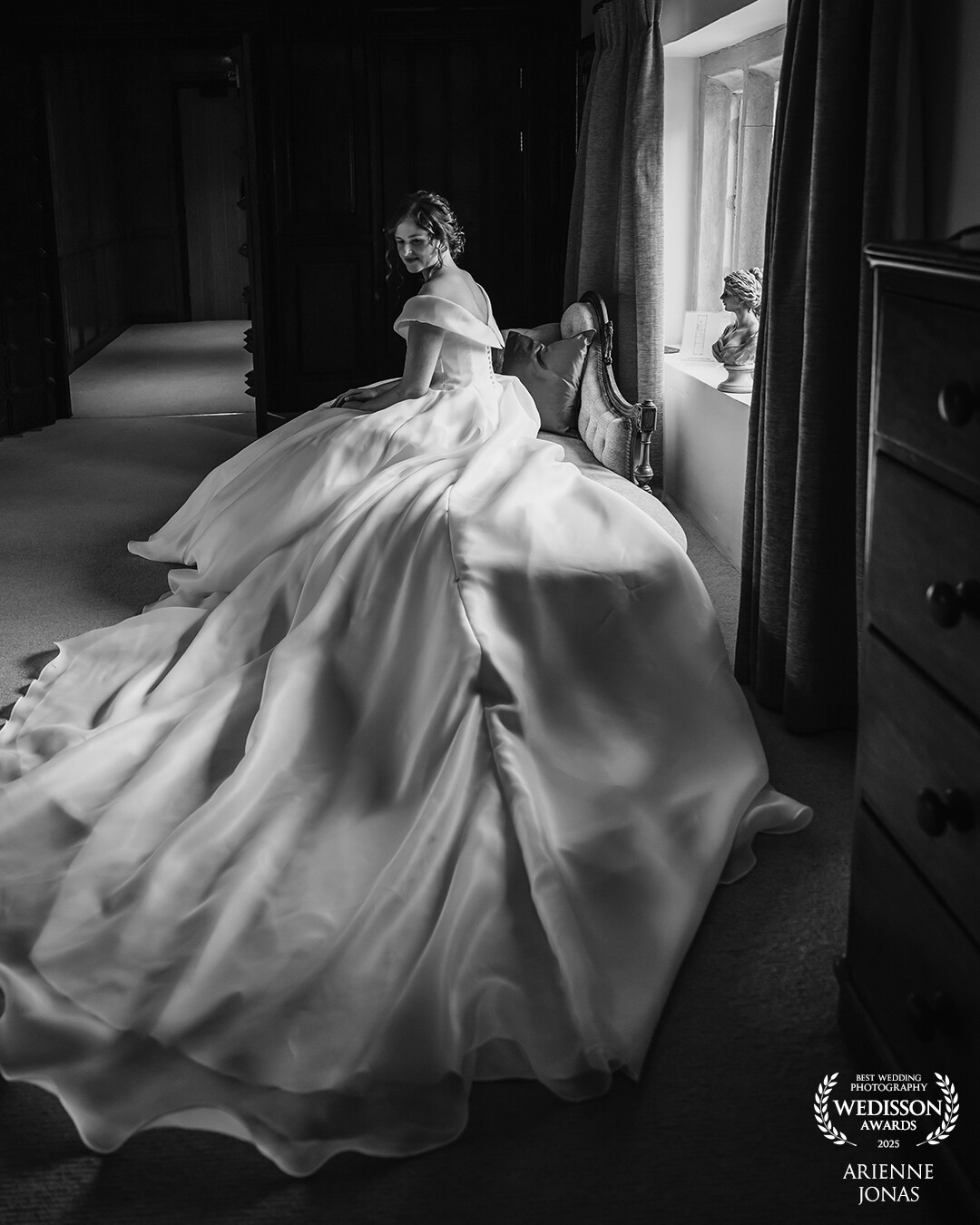 Bride is ready and taking a few moments as she listen to the rain outside and looking at her beautiful dress before she goes to meet her groom at Oxnead Hall
