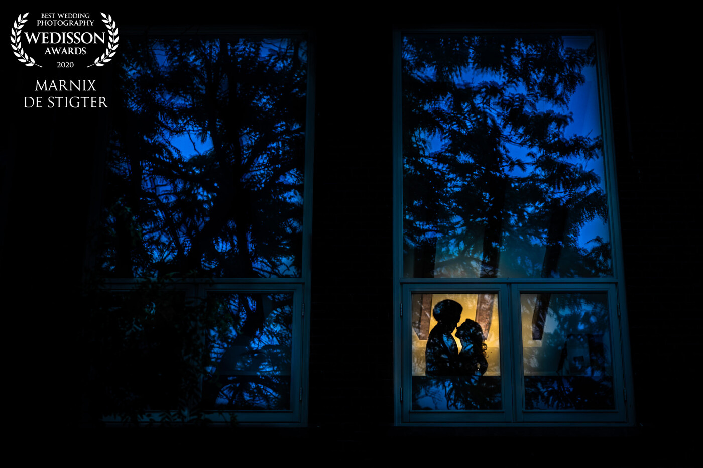 We started this couple's pre-wedding shoot at their home. When I arrived I saw the amazing big windows with the trees in the reflection, so this idea came into mind. We are really happy about how it turned out!