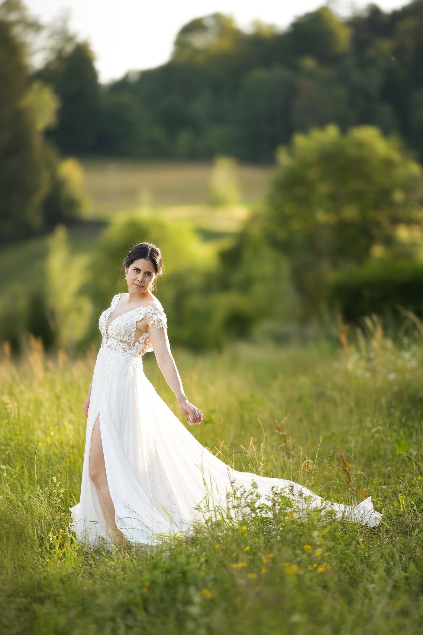 123rd CollectionThis photo captures a beautiful moment between a Swiss bride and an Eritrean groom on the outskirts of Zürich. The day began with a mix of clouds and sun, and I was concerned we might miss the golden hour. But just before sunset, the sky cleared, revealing a perfect, warm glow. The couple was incredibly adventurous, trusting me enough to follow through tall bushes and into an open field—where we found the perfect spot to capture this cheerful and elegant moment between them.