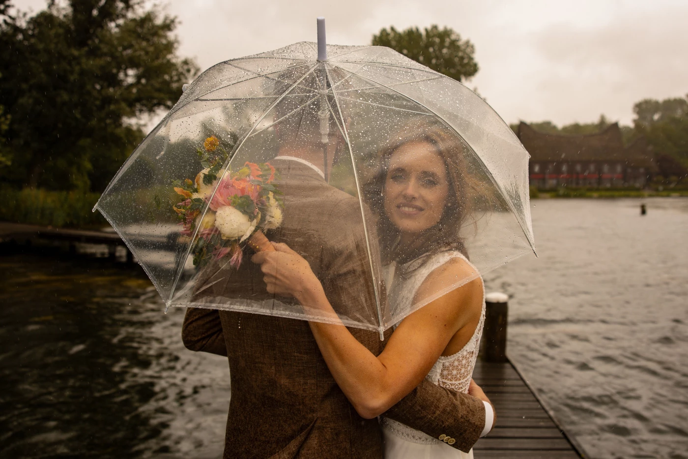 Hand in hand on a soaked pier, boots on, clear umbrella catching every raindrop like it was meant to be. Laughing instead of hiding, choosing joy instead of waiting for sunshine.