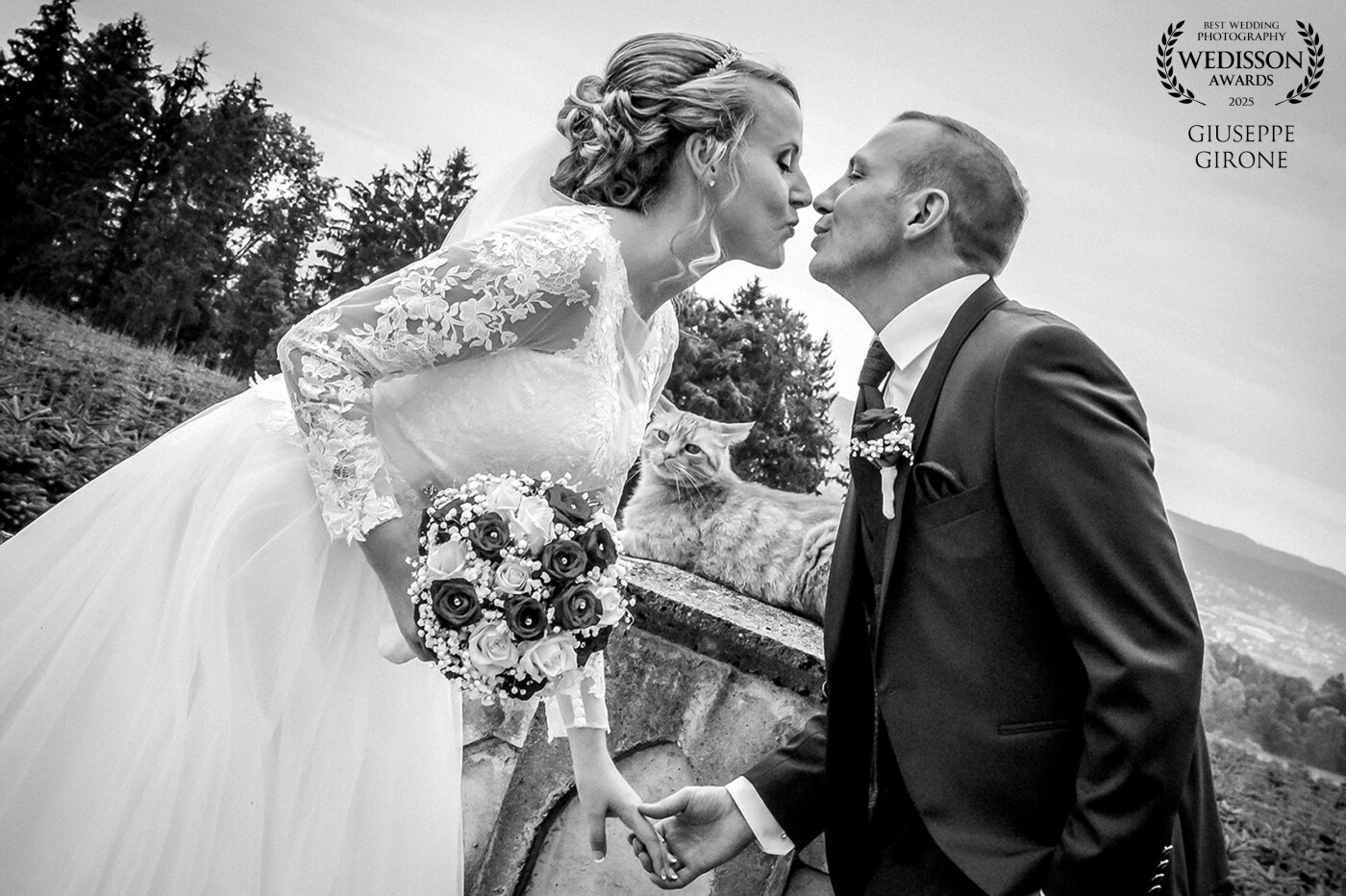 Nel mezzo di una folla frenetica che passa di fretta accanto a loro, la coppia di sposi si erge come un punto di quiete al centro delle vicende. Le persone intorno a loro si confondono nel movimento, i loro contorni sfumati, come trascinati dal tempo. Ma la coppia resta ferma, stretta in un abbraccio, e si scambia un bacio intenso. Il loro momento sembra sospendere tutta l’agitazione del mondo. Sullo sfondo, il Lago di Costanza si distende, calmo e sconfinato, sovrastato da un cielo con nuvole pittoresche che scorrono lievi. La luce si riflette sull’acqua, avvolgendo la scena in un delicato bagliore. Tutto intorno appare effimero e fugace, ma l’amore della coppia rimane immobile: sfida il tempo e resiste, mentre la vita continua il suo corso.