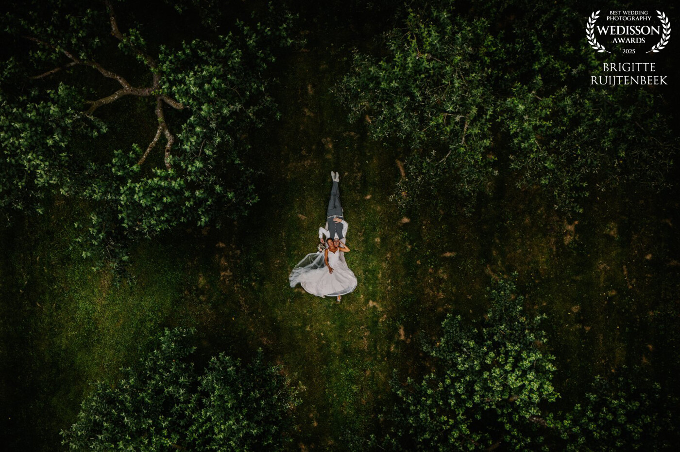 On a warm late-summer day, Joost and Leonie said âI do.â I photographed this intimate âtĂȘte-Ă -tĂȘteâ from above with my drone â the perfect way to highlight the stunning split in her wedding dress.