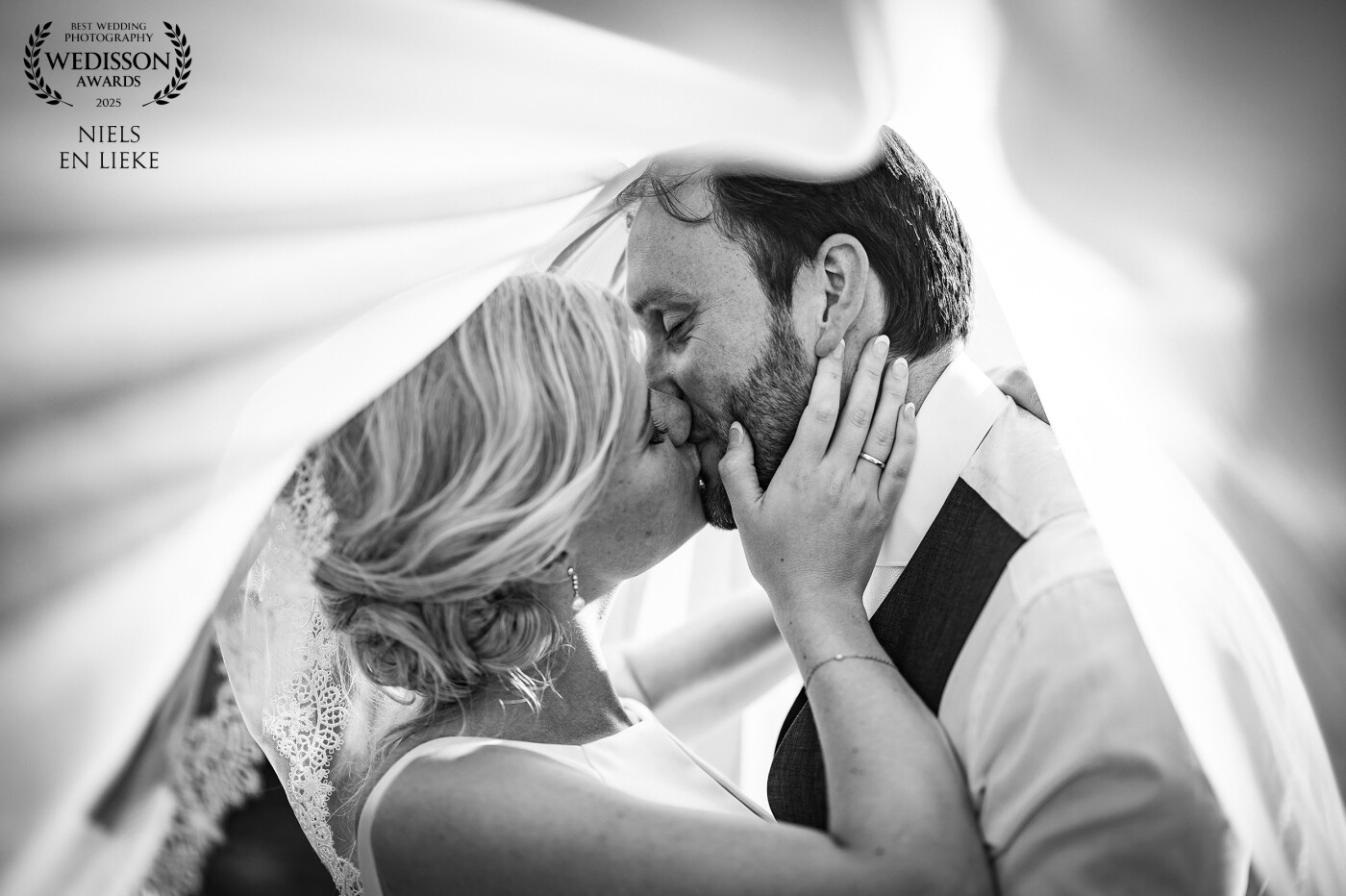 A black and white photo of a bride and groom kissing under the bridal veil, radiating pure joy.