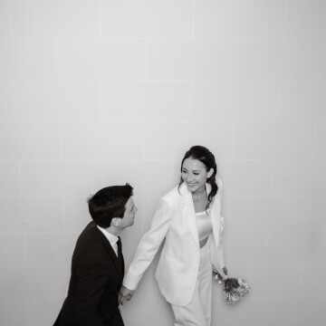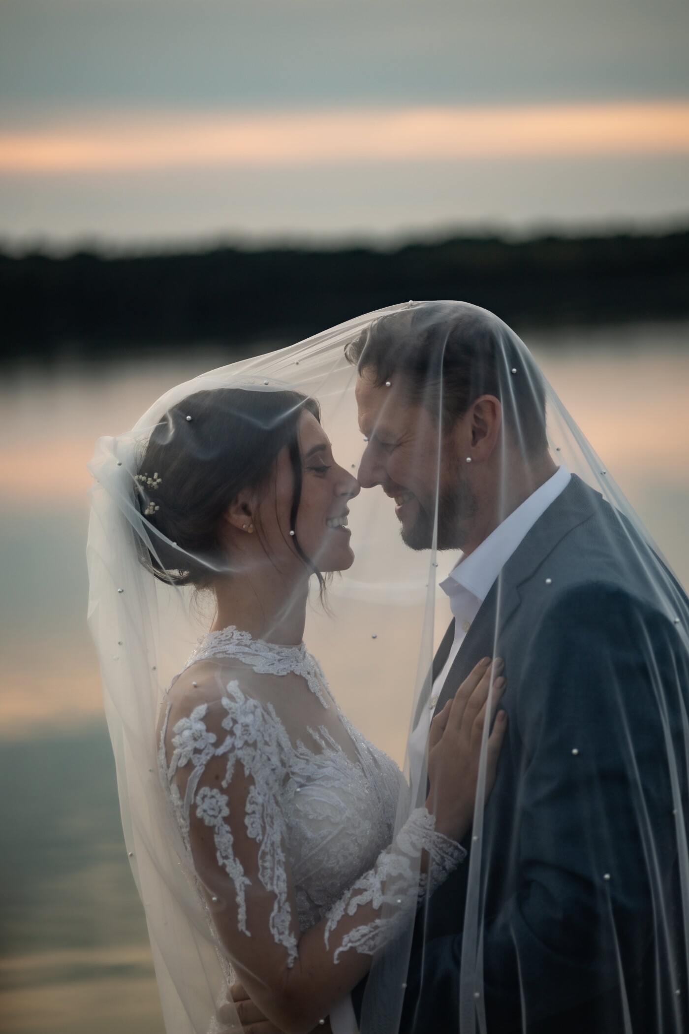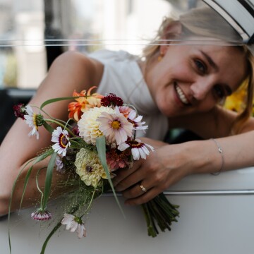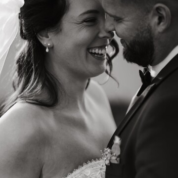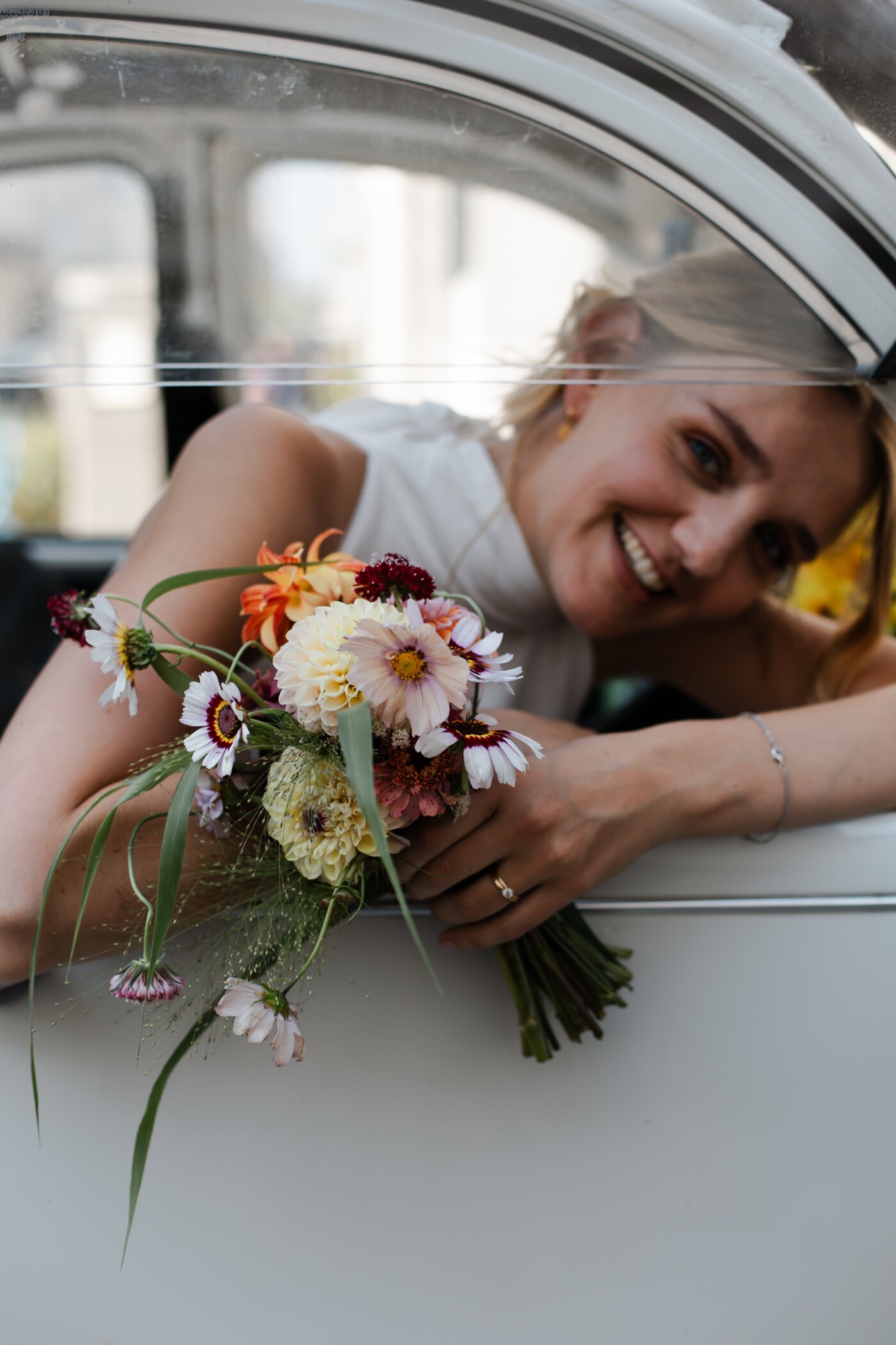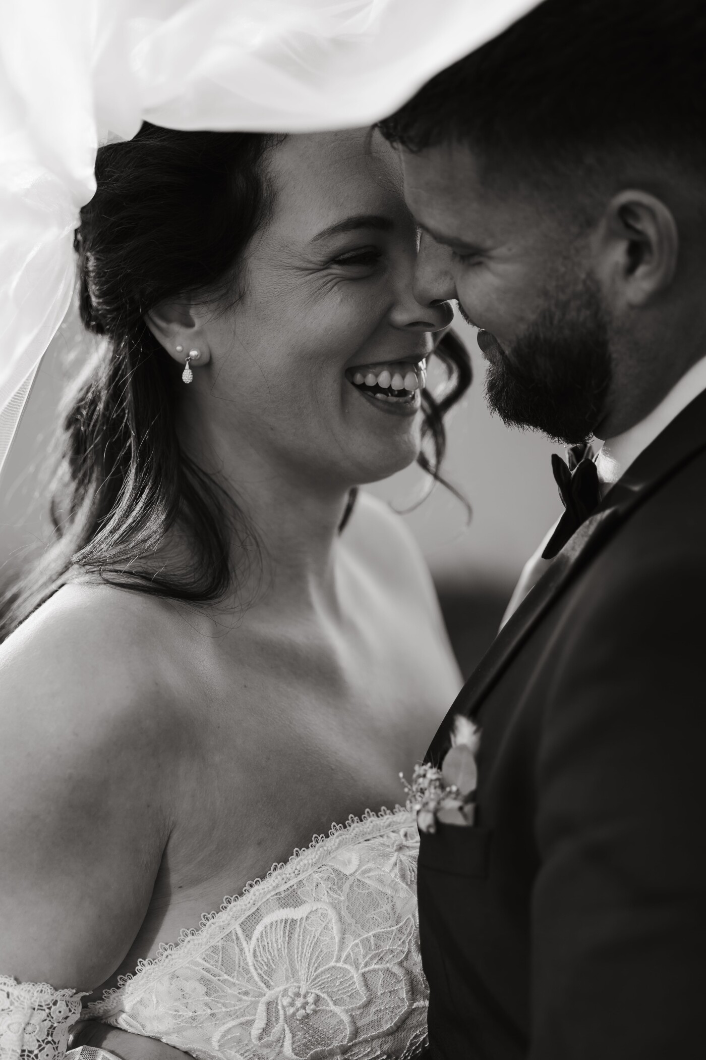 It poured rain on this autumn wedding day, so we worked fast in the short breaks between showers. I photographed the couple through the car window, using the frame-within-a-frame and the reflection of the trees to add layers. Their relaxed smiles in that tiny (more or less) dry moment make this one of my favorite images from the day.