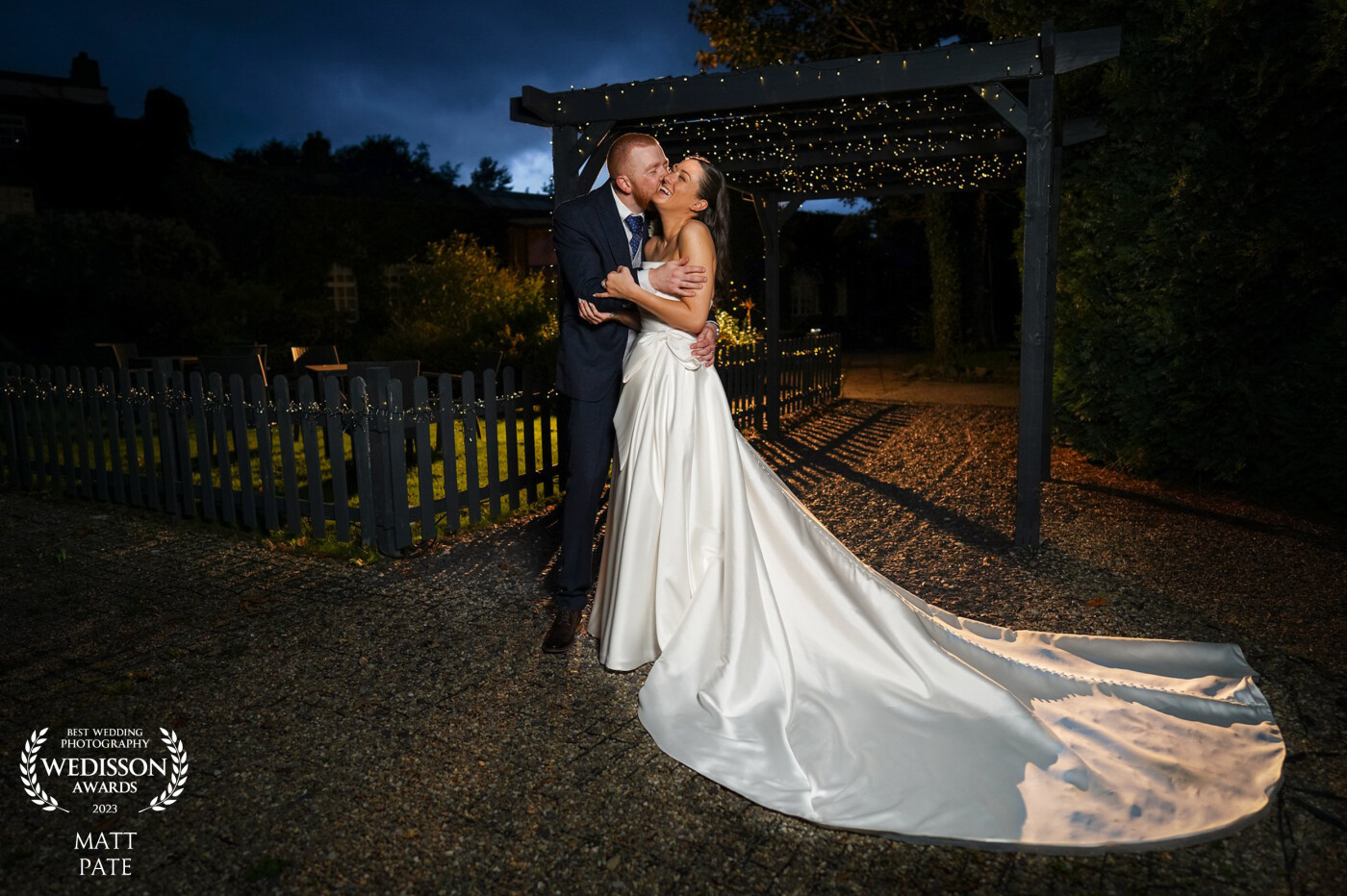 110th CollectionThere wasn't too much time to capture this sunset image at Heather & Jon's recent wedding, this colour in the sky didn't last long. I hurriedly set up a rear rim light and key light in a soft box, then ran over to find the couple with seconds to spare. I know they would love the fact the church where their ceremony was held is in the background.