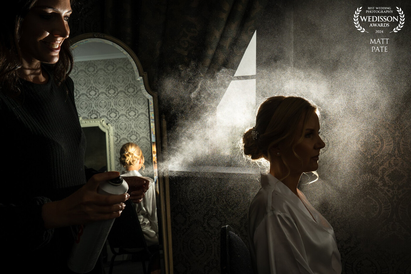 106th CollectionI felt an atmospheric image would suit this beautiful room in Ruthin Castle. I placed a small flash behind the bride to be, while her hairdresser sprayed the hair spray. I love this image especially for the light catching the smile from the hairdresser, the mirror providing a reflection of the brides hair also helps to tell the story...