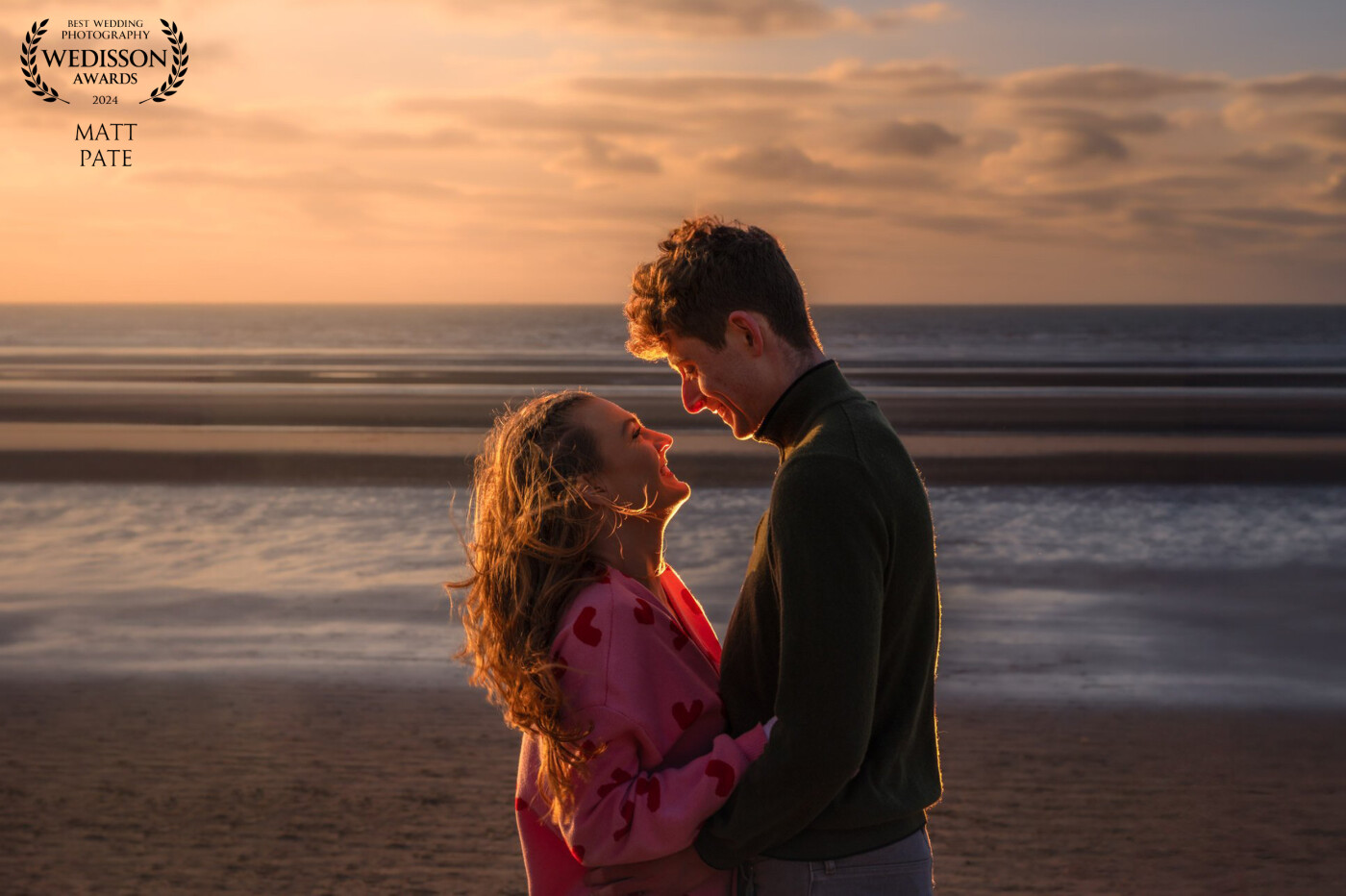 107th CollectionAnna & Jamie... A stunning sunset pre wedding shoot along Formby Beach. The sunlight behind them wasn't strong enough to create the desired effect, so I added a light behind them to create the warm glow.