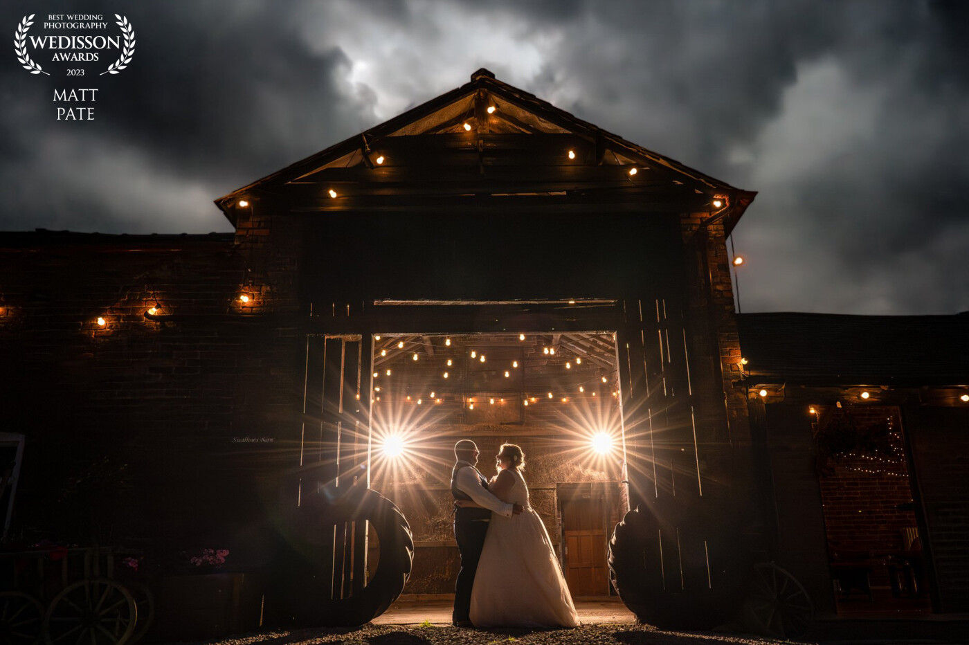 103rd CollectionLeanne & Scott... I had set up for a sunset shot, but Scott the groom had gone missing. Unfortunately we missed the short-lived sunset sky. Not wanting to give up, I decided to set up this back lit image using the twilight sky and stunning barn at Stock Farm Barn in Cheshire.