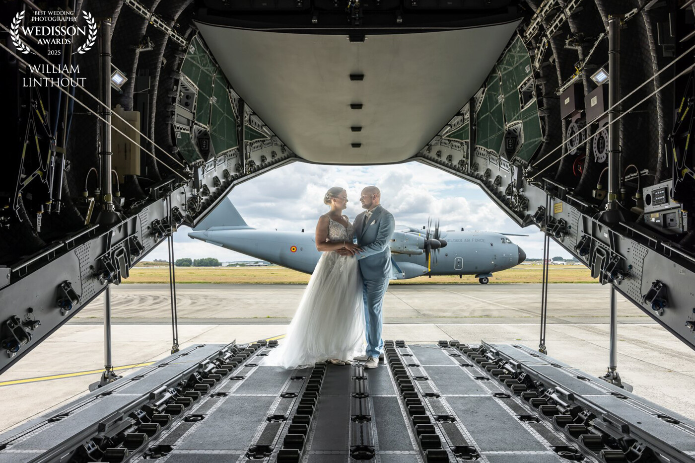 The groom is a soldier, so we were allowed to photograph at this military base. There was an approaching plane in the background, and since continuous flash wasn't possible (flash recharge time), it was crucial to wait for the decisive moment.