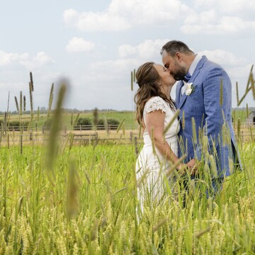 Bovenaan een trap met daarachter alleen wat lucht en bomen was een hele mooie locatie maar het koppel wel nog belicht met een flits met kleine softbox. De spontane pose van het koppel was perfect.